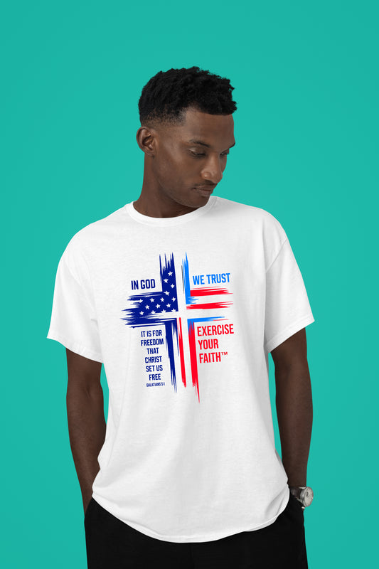 Exercise Your Faith In God We Trust Patriotic Cross T-shirt White