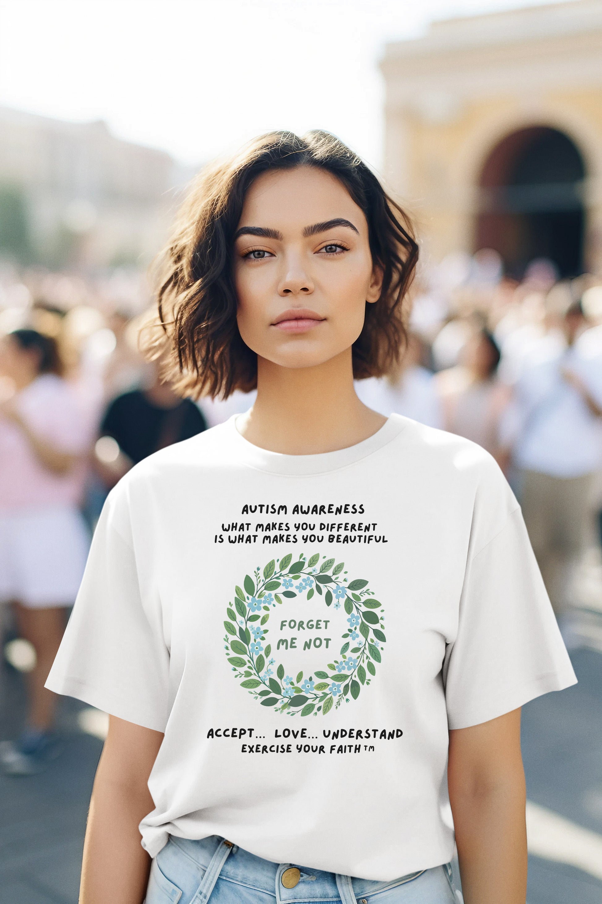 The delicate blue forget-me-not flower helps to raise awareness and acceptance for those with autism. It symbolizes remembrance, understanding the importance of acceptance, and inclusivity. The circle of forget-me-not flowers in this design represents unity and support for autism acceptance and awareness. Let us embrace that what makes us different makes all of us beautiful in the eyes of God.